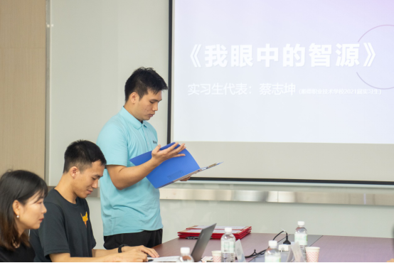 接着由2021届实习生代表蔡志坤发言《我眼中的智源》,通过他的发言,我们看到智源科技有限公司是用心在培养每一位学生,不仅在工艺流程、专业技能上给予最好的指导,而且在生活上给予最大的关怀和帮助,让学生在公司有很强的企业归属感。