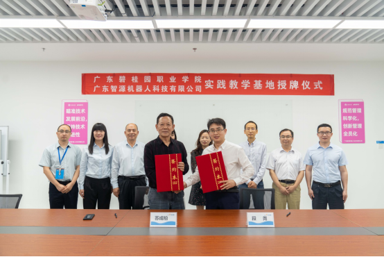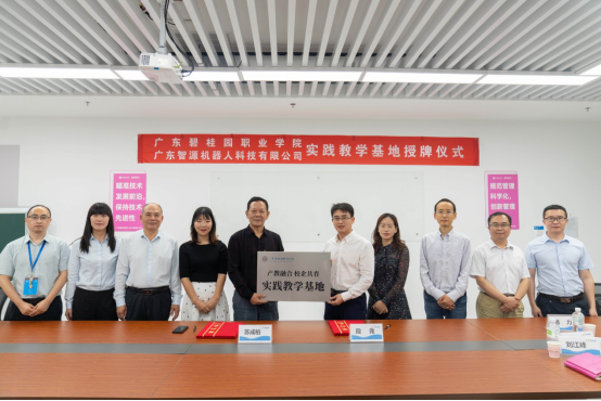 为贯彻落实学院产教融合、校企共育,推进机器人技术系课程建设与改革,做好人才培养工作, 3月31日上午,学院在千玺机器人集团旗下的智源科技有限公司举行机器人技术系首个校外实践教学基地授牌仪式。千玺机器人集团副总经理周俊华,千玺机器人集团副总经理兼智源科技有限公司总经理段尧、智源科技有限公司研发中心电控部副总监陈松林、智源科技有限公司人力综合部经理吴美云、智源科技有限公司人力综合部招聘主管陈智泳、学院副院长苏成柏、教务处处长刘江峰、校企合作处处长杨力、机器人技术系主任梁荣新等领导出席此次授牌仪式,校企双方就如何贯彻落实学院提出的“三段式”人才培养模式改革,共同培养基层一线管理干部或技术骨干进行了深入交流。