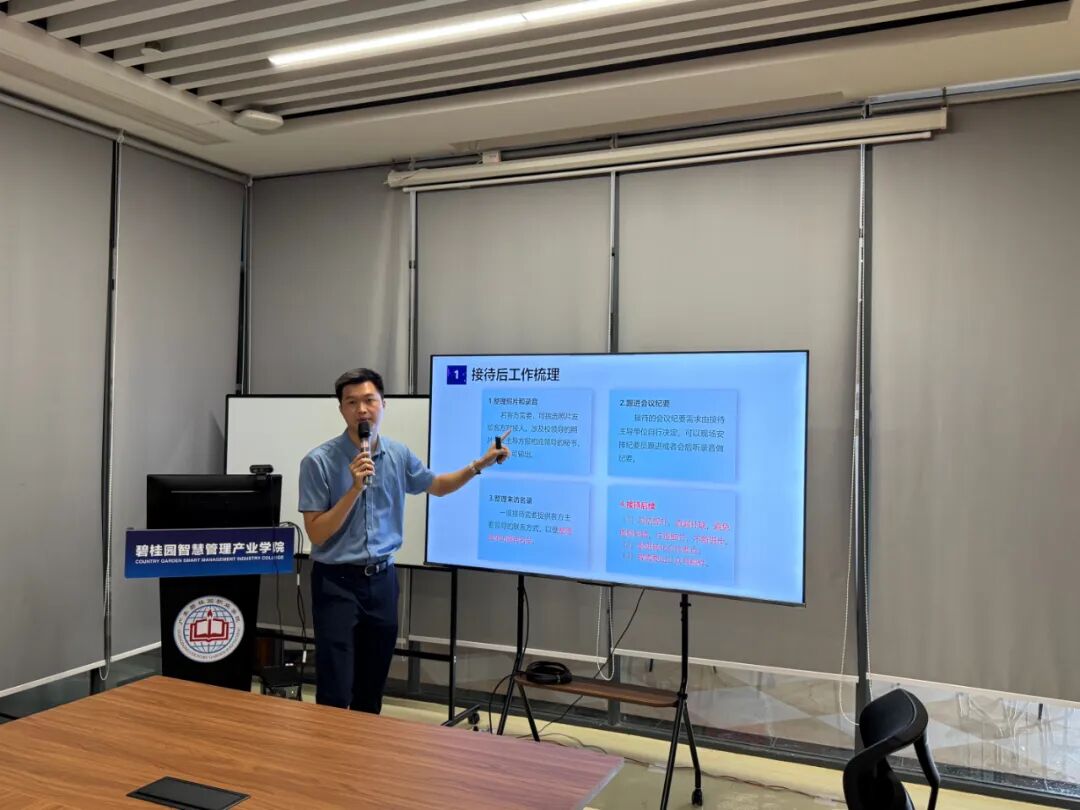 为夯实产业学院学生职业通识能力,提升学生现代服务与礼仪沟通软实力,10月10日,碧桂园智慧管理产业学院(下称:产业学院)举办“第二届现代服务与礼仪沟通专项培训班”,吸引了20多名来自不同专业的学生报名。本次培训班由产业学院管委会综合办公室主任 朱家俊主讲,朱老师凭借此前在集团筹超千场商务会议、政企交流、行业峰会、来访接待的实战经验,以“场景化教学+标准化实操”为核心,为同学们带来一场兼具实用性与前瞻性的职场会务服务与接待礼仪课程,助力学生解锁职场“软实力”。