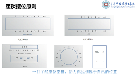 摆位原则:座谈“以左为尊”(客方坐主人右手位),用餐“以右为尊”(主宾坐主人右侧),再引申到当会谈时人数为双数时、当用餐按“两个中心”摆法时等作法,用简单口诀化解复杂规则。