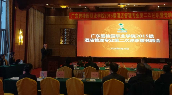 4月26日,2015级酒店管理专业兰丽聪等9名学生在清远假日半岛酒店进行了第二次述职暨竞聘会,学院副院长苏成柏,教务科研处、酒店管理教学部负责人,酒店总经理胡建华、夏明珠,部门经理、企业导师约50人参与此次会议。