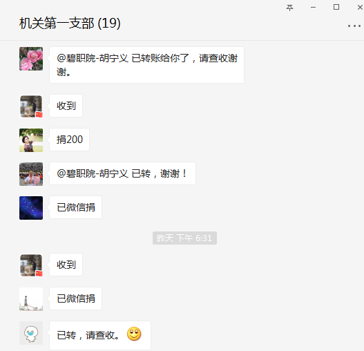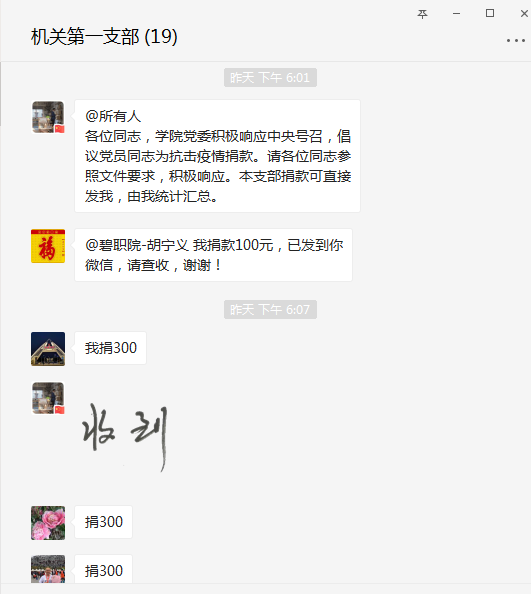 新型冠状肺炎疫情牵动着全国人民的心。疫情面前,需要信心和勇气!需要团结与互助!更需要你我伸出温暖之手!为积极响应党中央对广大党员的号召,2月28日,学院党委印发《中共金年会jinnianhuicom委员会关于做好党员自愿捐款支持新冠肺炎疫情防控的通知》。倡议一发出,机关第一党支部全体党员热烈响应,不到一个小时,在党员领导干部的带领下,支部19名党员全部参与捐款,自觉自愿为抗疫工作贡献力量。