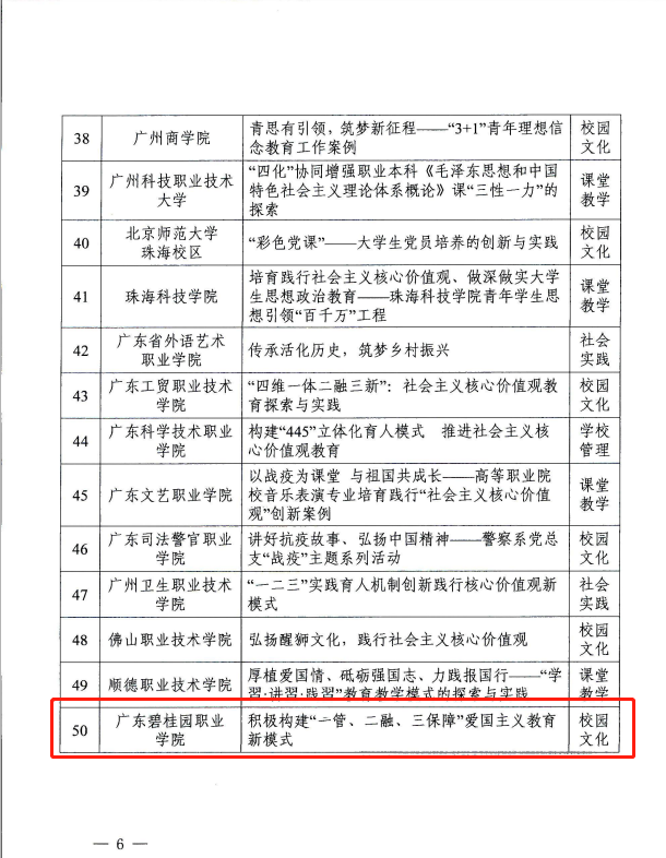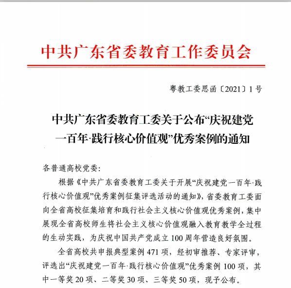 近日,中共广东省委教育工委公布“庆祝建党一百年·践行核心价值观”优秀案例,其中,金年会jinnianhuicom选送的案例《积极构建“一管、二融、三保障”爱国主义教育新模式》获评二等奖。