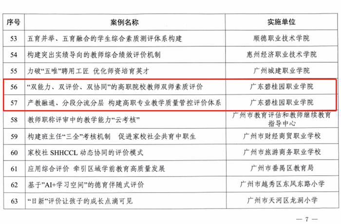 近日,广东省教育厅办公室公布了第二批教育评价改革典型案例评选结果,本次发布的本专科院校、省属中小学和职校典型案例共计83个,我院报送的《双能力、双评价、双协同,高职院校教师“双师素质”评价改革的创新与实践》及《“产教融通、分段分流分层”构建高职专业教学质量管控评价体系》二个案例全部入选。