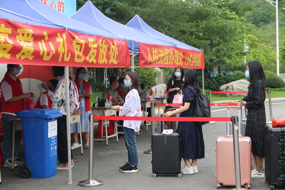 帮助学生行李进行消毒后,“霸总”老师接上学生一路顺利返校。迎候在校门口的老师和教官,严格按照要求对学生进行体温检测、健康码验证近14天行程,同时为学生更换新口罩。学校还专门准备了防疫爱心礼包,里面除了口罩、消毒剂等防疫物品外,还放了毽子、苹果桔子,寓意平安吉祥,暖心之举赢得学子怒赞。