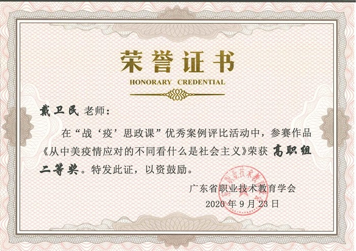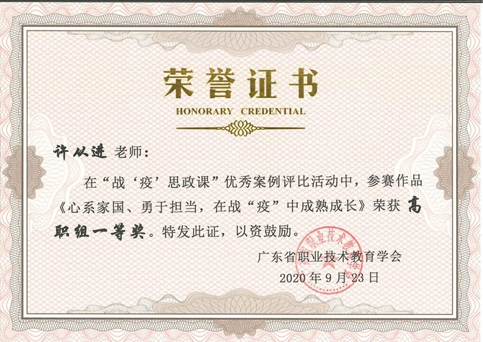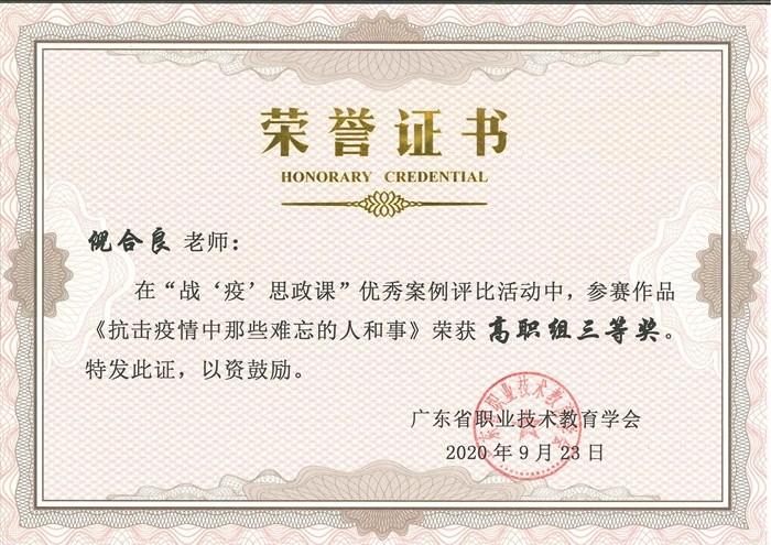 由广东省职业技术教育学会发起并组织的“战'疫'思政课”优秀案例征集和评选活动落下帷幕,学院党委书记许从进《心系家国、勇于担当,在战'疫'中成熟成长”》荣获一等奖,学院思想政治理论课教学部主任戴卫民《从中美疫情应对的不同看什么是社会主义》荣获二等奖,学院思想政治理论课教学部副主任倪合良《抗击疫情中那些难忘的人和事》荣获三等奖,广东碧桂园职业学院荣获优秀组织奖。