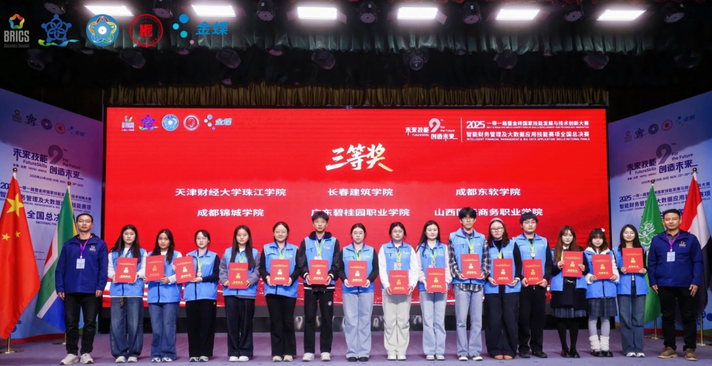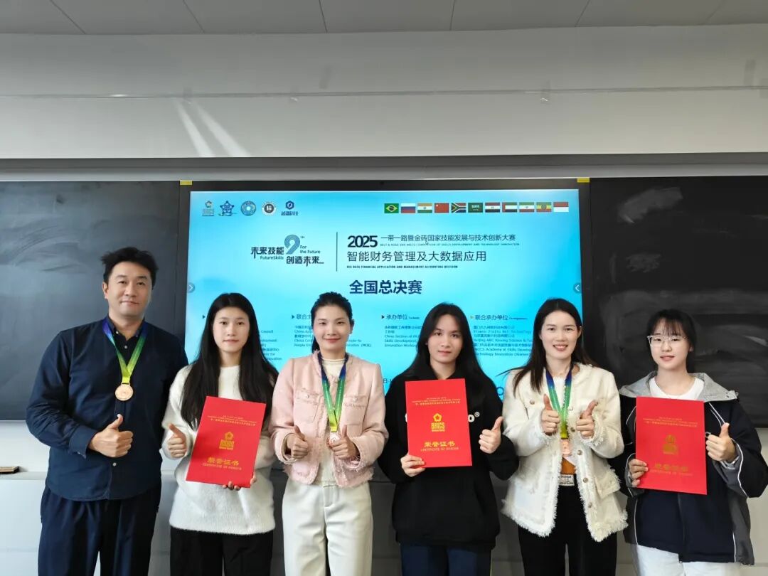 11月30日,“2025一带一路暨金砖国家技能发展与技术创新大赛——智能财务管理及大数据应用技能全国总决赛”在合肥圆满落幕。金年会官网数字经济与管理学院学生莫菲、林可晴、卢美兰,在林媚、吴雪冰、乔柳杨三位老师的全程指导下,与来自全国27个省市自治区、78所高校的优秀队伍同台竞技。他们凭借扎实的专业能力与出色的现场表现,从众多参赛团队中脱颖而出,最终荣获全国总决赛三等奖,为学校争得了荣誉。