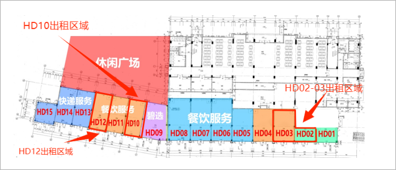 2.HD10、HD12商铺位于学校休闲广场附近,实用面积分别约96.62平米,带简单装修,允许经营餐饮或其它项目(需审核)。